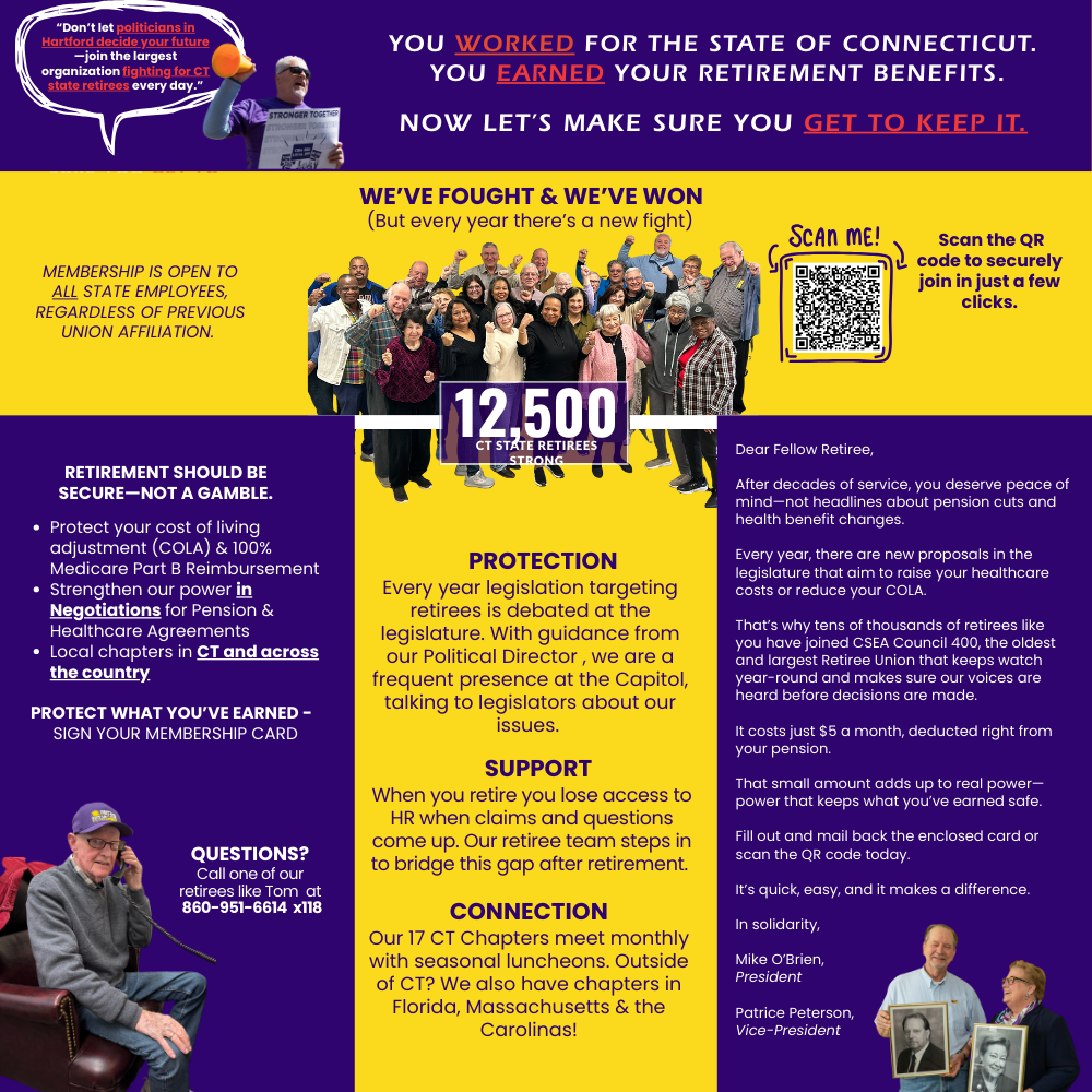 CSEA Council 400 is the oldest and largest organization representing public sector retirees in Connecticut. Established in 1962, Council 400 now has 12,500 members in 26 chapters across five states. In Connecticut alone there are 17 chapters. The other states include Florida, Massachusetts, and North and South Carolina.